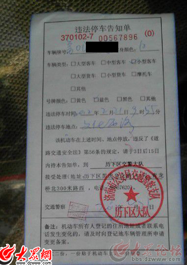 從網友上傳的圖片中,記者看到,被貼罰單的是輛掛有魯O牌照的白色警車,車門上噴有“司法”字樣。在違法停車告知單上,清楚的寫著:違法停車時間為2012年2月21日9時55分,違法停車地點為文化西路,單子下方還蓋有濟南市公安局交通警察支隊歷下區大隊的公章。