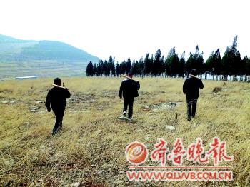 21日上午,記者來到了市中區齊村鎮銀莊村,銀莊村三面環山,地勢復雜崎嶇,是狼比較喜歡出沒的地形。10點30分左右,記者跟隨一支打狼小分隊上了山,開始尋狼。這支小分隊由四人組成,都是齊村鎮政府的工作人員,他們每人手里都拿著一根長約1米、比較粗的棍子。