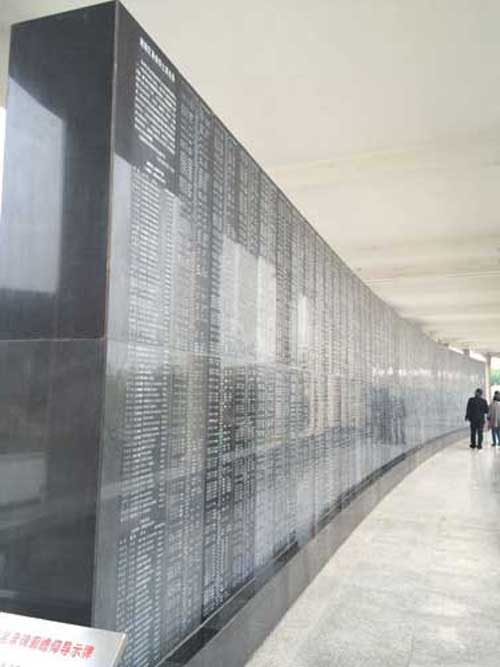 這里有一面全世界最震撼的墻,無數的大理石碑集合成四塊巨大的碑林墻,墻體兩側,銘刻著濱州老鄉們能夠查找到的五萬五千三百零八個烈士的名字。導游的小姑娘告訴我們,這份名單肯定不全,說不定翻一倍不止,但是我們條件有限,那么動亂的年代,也就只收集到了這些人的名字、職務、犧牲地。說著,她用手指著不遠處彎腰看碑文的一個老大爺,說這地方經常有人前來祭奠。