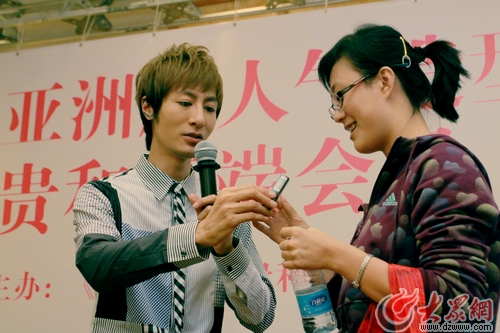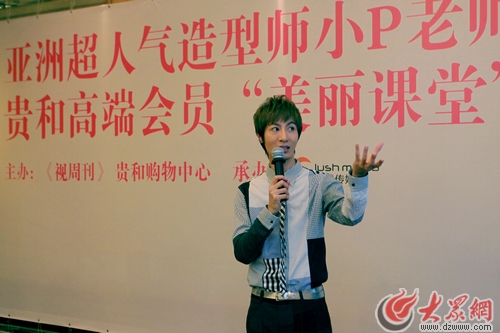 值貴和購物中心13周年店慶即將來臨之際,為營造“2010貴和首屆秋季化妝節”的熱烈氛圍,9月29日,貴和購物中心與《視周刊》攜手,邀請小P老師來到貴和皇冠假日酒店開授“美麗課堂”。當天下午,首先在貴和購物中心一樓大廳舉行了小P老師的媒體見面會,小P老師一人進入貴和購物中心F1層大堂,即可就有熱情的美女粉絲獻上了精致的花束。小P老師在現場眾多擁躉的歡呼聲中熱力登場。在接受齊魯電視臺主持人劉爽的采訪時,小P老師暢談來到濟南的感受和對美容、造型方面的獨特體會,面對熱情的粉絲和媒體記者的提問,他也是來者不拒,耐心細致的進行解答。