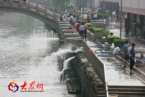 今天上午9點,記者趕到泉城廣場,泉標東側(cè)下沉廣場兩側(cè)已經(jīng)聚集了很多市民,記者看到,整個下沉廣場已經(jīng)成了一個大水池,水面上漂浮著很多貨物,只有廣場燈柱的頂部還露在外面,估計水深在兩米左右,十余臺水泵正在緊張地向護城河內(nèi)排水。銀座購物廣場的各個入口均已封鎖,記者無法進入,但從上面可以清楚地看到里面的積水。