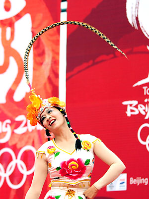 A performer greets the Olympic torch with a dance routine as it passes through Jinan in Shandong province, July 23, 2008, [Xinhua]