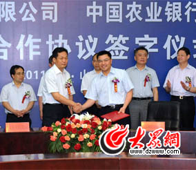 山東省金融辦副主任郭永利、人民銀行濟南分行副行長肖龍滄、山東銀監局副局長王朝弟應邀出席簽字儀式。儀式上,農行山東省分行行長陳軍、山東海洋投資有限公司董事長包劍英先后致辭,農行山東省分行副行長張曉男、山東海洋投資有限公司董事長襲建兵副總經理分別代表雙方簽署《戰略合作協議》。