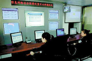 6日下午,青島市公安局信息網絡安全報警處置中心正式開通,有害手機短信息的受理和查處工作也同時展開。據介紹,該處置中心將擔負起全市計算機信息網絡安全保護等任務。圖為民警在網絡上值勤。 (徐勇 張毅民)