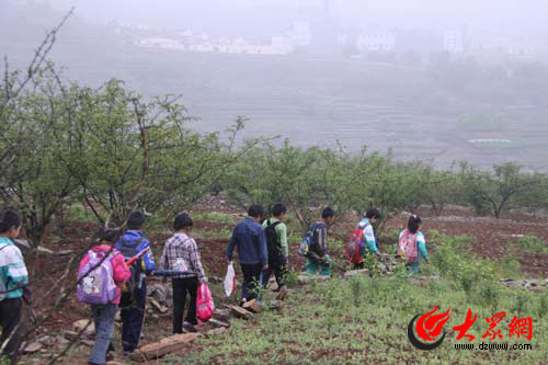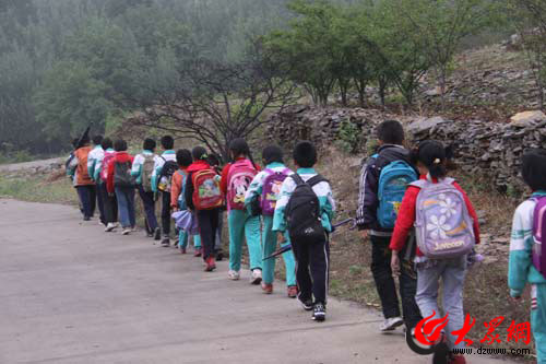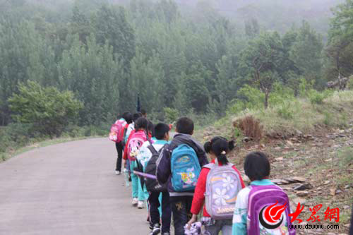 5月17日下午5點左右,臨沂市沂水縣西部的群山里云環霧繞、細雨蒙蒙。在夏蔚鎮透明崮村旁的環山公路上,一群高矮不一的孩子正冒雨排隊往前走。他們都是夏蔚鎮透明崮教學點剛剛放學的學生,他們的家就散落在周圍大山深處的十幾個自然村里,最遠的學生要翻越一座大山,走將近兩個小時才能到家。