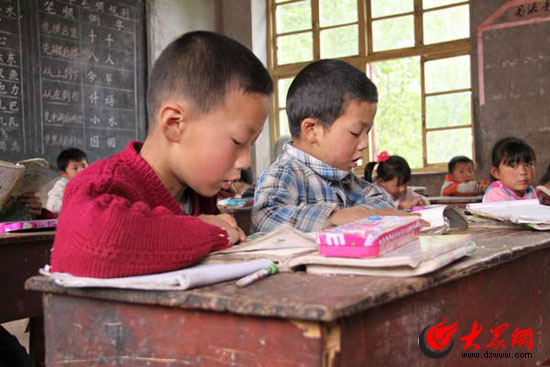 一間簡陋的教室里,四個年齡稍大的孩子坐在一側,手捧著課本,大聲地朗讀;而在另一側,十余個小點的孩子,則瞪著好奇的眼睛東張西望……5月18日下午,在沂水縣夏蔚鎮土洼小學的一間教室里,記者看到了這奇怪的一幕。學校的老師告訴記者,并不是這里的學生不愛學習,不守紀律,而是因為這是一個特殊的班級。