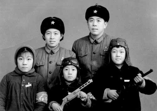 我清楚地記得,當(dāng)時(shí)濟(jì)南天橋照相館照三寸的黑白照加洗三張,還不到1塊錢。走進(jìn)攝影室,我和弟弟幾乎同時(shí)看到了兩支沖鋒槍小道具,又幾乎同時(shí)沖上前去一人搶了一支。也許是由于從小的生長環(huán)境,加上那一時(shí)期宣傳的“深挖洞,廣積糧,全民皆兵,嚴(yán)陣以待,隨時(shí)消滅一切膽敢來犯之?dāng)场钡囊庾R(shí)在我們幼小的心靈里深深扎下了根,弟弟端起沖鋒槍顯得特別來精神,我手握沖鋒槍,立刻有一種為我們偉大祖國站崗的自豪感和隨時(shí)為國捐軀的沖動(dòng)。父親、母親一身戎裝站在3個(gè)兒女的身后,父親整了整我和弟弟的“空軍飛行員”帽,詼諧地說,我們一家全民皆兵呀。姐姐瞥了一旁兩個(gè)煞有介事的持槍的弟弟,不愛紅裝愛武裝的她有點(diǎn)失落地說,可我不是呀!父親用手抖了抖姐姐右手臂上的“紅衛(wèi)兵”袖章,提示道:你也是一個(gè)“兵”呀。全家人都樂了,攝影師傅在這歡快的氣氛中,記錄下了這美好的瞬間。
