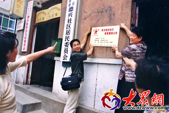 在濟南市槐蔭區(qū)振興街德興社區(qū),齊魯晚報首次掛起記者大名片。(徐延春攝)
