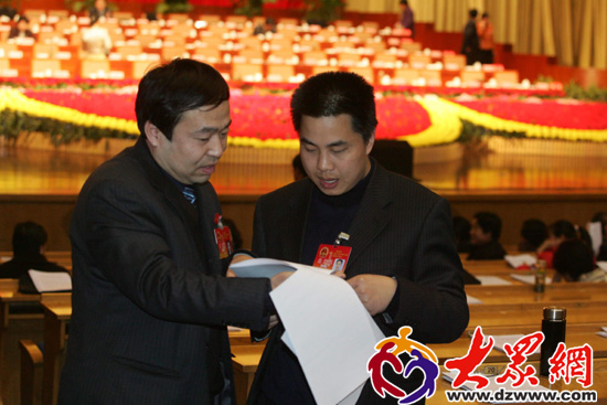 在濟南市第十三屆三次人代會上,張剛代表(右)與其他代表商議欲提交的方案。(周青先攝)