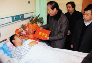 他說,自己受傷后,不但單位、所在的市政府以及各級(jí)領(lǐng)導(dǎo)來看他,最讓他感動(dòng)的是,很多普通市民也不斷地來看望他,送花、牛奶、錦旗和愛心款。讓他印象最深的是有一天深夜,一個(gè)好心人趕了過來,“當(dāng)時(shí),我傷口疼得厲害,睡不著,他過來了,就說了一句話,你真勇敢,了不起!放下200元錢扭身就走,我們家里人追出去問他的名字,可他就是不說,真的很感激這些幫助我的人。”