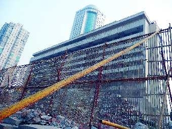 25日,樓前搭起了防護網(wǎng)。本報記者 李飛 攝