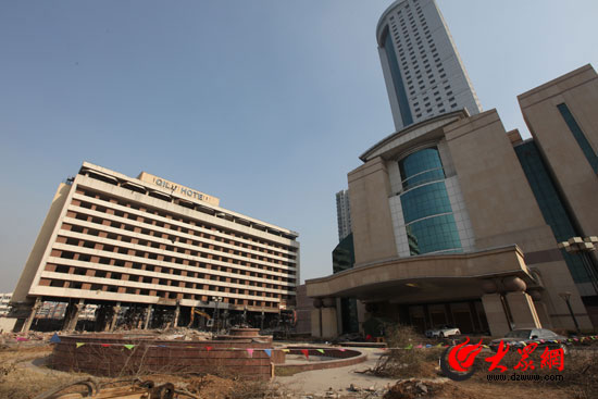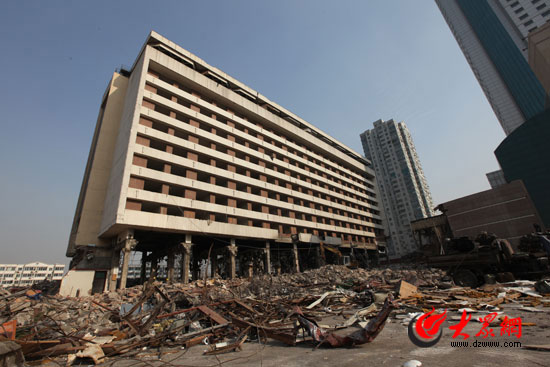 正待爆破的齊魯賓館在廢墟上挺然而立。(曹亮 攝)