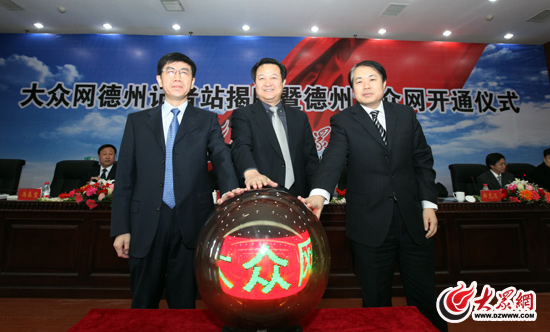 省委宣傳部副部長劉保聚(中),省網絡文化辦公室主任劉致福(右),大眾報業集團黨委常委、副總編輯郝克遠(左)共同按下水晶球開通德州大眾網。(記者 曹亮攝)