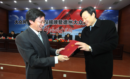 大眾網董事長、總經理林忠禮(左)向德州市委宣傳部常務副部長趙泉江(右)頒發大眾網德州記者站名譽站長聘書。