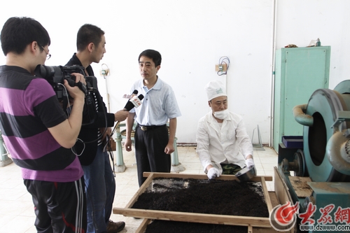 佛泉茶廠負責人正向“今夏再喝北川茶”采訪團記者介紹他們新產(chǎn)品紅茶的生產(chǎn)工序