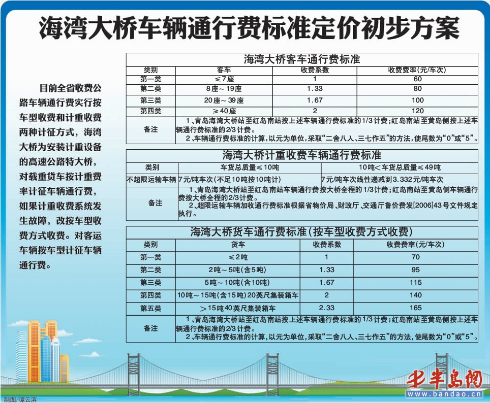 車輛通行費標準的計算,以元為單位,采取“二舍八入、三七作五 ”的方法 ,使尾數為“0”或“5”。此外,青島海灣大橋站至紅島南站按正常車輛通行費標準的1/3計費;紅島南站至黃島側按正常車輛通行費標準的2/3計費(具體收費方案詳見圖表)。
