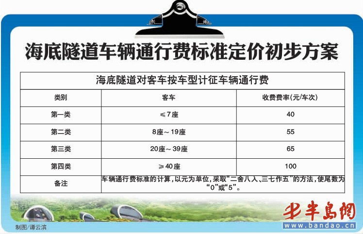 5月25日,市物價局發布了海灣大橋、海底隧道車輛通行收費標準定價初步方案,根據初步方案 ,海灣大橋、海底隧道對客運車輛都按車型計征車輛通行費。而車型又分為≤7座、8座~19座、20座~39座、≥40座四類。