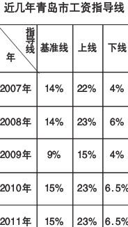 [提要] 繼山東省發(fā)布企業(yè)工資指導(dǎo)線后,青島市的工資指導(dǎo)線也于5日正式公布。據(jù)介紹,2011年青島市工資指導(dǎo)線以企業(yè)自身 2010年平均工資為基數(shù),基準(zhǔn)線為平均工資增長15%,上線(預(yù)警線)為平均工資增長23%,下線為平均工資增長6.5%。