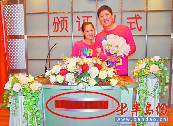 曹罡和段雪嬌是當天第二對預約的,兩人7年前在大學認識,2009年一起來到青島,一個工作一個讀研!拔覀冇X得這個日子非常好,6個1在一塊多順啊!巧合的是,我們的新家在11樓,家里座機的最后兩位也是11,因此在我們看來這一天領證意義特別大。”段雪嬌說。
