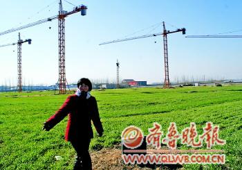 4日上午11時許,記者來到位于蒼山縣蘭陵法庭對面的“錦繡蘭陵”施工現場,30余名交了購房款的人正在此處。看到一大片麥田里豎著5臺大型塔吊,看不到一點工地的樣子,也沒有工人在施工,工地靠近路的一邊,一塊“奠基”的石碑在長滿麥苗的土地上裸露出來。