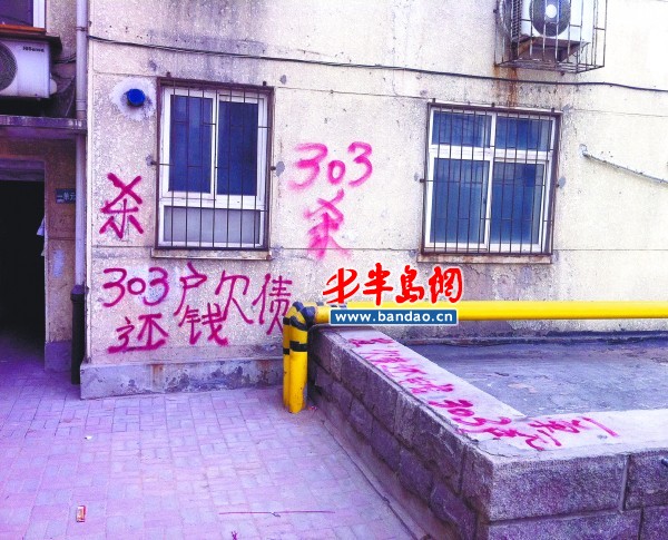 [提要] 小年夜,本來應該是熱鬧祥和的氛圍,但是住在濟陽路5號的居民,卻被眼前的一幕驚呆了,“殺”“303戶欠債還錢”……鮮紅的字,讓樓上的居民倍感刺眼。“這大過年的,怎么還有人做這種事啊?這不是給我們添堵嗎?誰欠錢就去找誰,為什么把我們的樓道上都寫著這些紅字啊?”樓上的居民說。