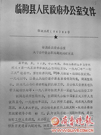 岳老先生和原公社為此事多次向上級反映,經縣經委政策領導小組研究,認為造成這一問題的原因,是當時工作人員疏忽,未辦理正式調動手續,組織遺漏所致。1986年12月3日,縣人民政府辦公室專門為岳老先生正式下發了(86)86號文件,恢復他的正式職工身份,工資定為機關工人級,月工資執行62.50元,工齡連續計算,工資從批準之月執行,仍留九山工作,并由勞動局、企業局補辦有關手續。臨朐縣政府下發文件后,岳老先生吃了定心丸,但是接下來的發展卻讓他感到非常無奈。