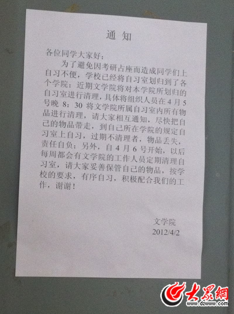 在自習室,記者看到教室的課桌上明顯有經過清理的痕跡,桌面還算比較干凈。講臺上則放著幾摞不同類別的書,在自習的學生說這些書是以前有的學生拿來占座的,學校清理自習室時把桌上的書都放在了這里。在自習室門口貼著一張文學院發出的通知,大體是說學院將每晚對自習室進行清理,請學生妥善保管自己的物品。記者隨機采訪了幾名同學,一名文學院的同學告訴記者,這幾間教室因為經常有課,而且能坐很多人,所以來占座的并不多。“熱門”的幾間都是小自習室,比較安靜,平時安排的課也少,多數同學都喜歡去那里占個座位。