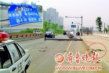 本報(bào)96706熱線消息(記者 董釗 通訊員 路文生)22日早上7時(shí),在西客站齊魯大道與清源路交叉口,一大型交通指示牌桿被撞倒,其底座被連根拔起,肇事車輛逃逸。經(jīng)過5小時(shí)周密偵查,槐蔭交警大隊(duì)找到肇事車輛。