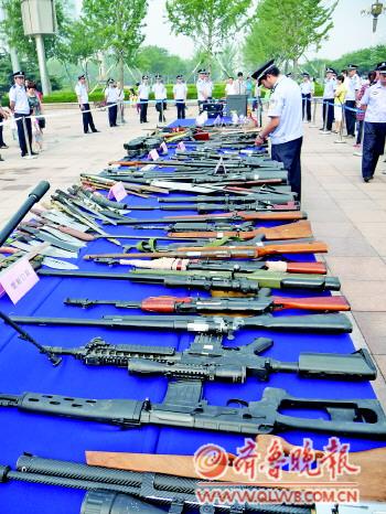 [提要] 6月2日上午,濰坊市公安局在人民廣場上進行“打黑惡、反盜搶”安民行動成果展示,展示了繳獲的各種槍支、管制刀具、毒品等,以及汽車、摩托車等贓車百余輛。