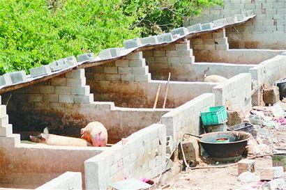 記者只好佯裝離去,待男子騎車走遠后,又原路返回,發現果園中心位置以及果園西側遍布了豬圈。每排豬圈有四五個豬舍,每排豬舍前有數個大鐵鍋,鍋里裝著泔水。養豬人操外地口音,住房就蓋在豬圈旁邊,一家人都住在簡易的平房里。周遭環境惡劣,從泔水里撿拾出來的塑料袋等被堆積在一邊,蚊蠅亂飛。