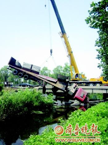 濟(jì)青高速公路路政人員說,大型吊車之前試圖將貨車吊出,但因貨車太重造成鋼索斷裂。后又送來直徑達(dá)4厘米的鋼索,但因鋼索穿插時,平衡點(diǎn)難以掌控,導(dǎo)致操作又一次失敗。而趕來的路政工程車由于牽引力不夠,無法將貨車拖出。