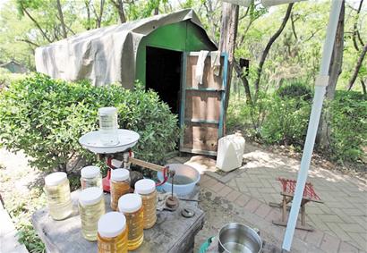 “想要洋槐蜜?我這都是剛打出來的,30元兩斤,價格也不貴,來點吧。”在櫸林山上一個支著太陽傘的攤位前,自稱姓王的攤主來自日照,看到記者猶豫,王某主動降價,“20塊錢一斤半怎么樣?”王某回到帳篷里,用水舀子從一個白色的大桶里舀出顏色很淡的液體裝入瓶內。記者看到,除了幾個白色的大桶,帳篷內的擺設很簡單,沒有太多的生活用品和養蜂工具。“怎么沒看到你的蜂箱啊?”記者詢問。男子隨手往對面一指,“那些都是我的。”當記者要求他帶著過去看看時,他卻推說自己還有別的事。
