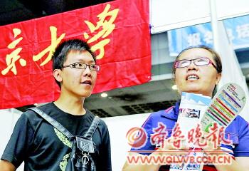 6月25日,在濟南的高招咨詢會上,一名考生從北京大學的咨詢臺前走過。(資料片)              本報記者 王媛 攝