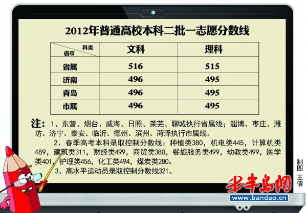 24日晚,省招考院公布我省2012年普通高校本科二批一志愿分數線,省屬線為文科516分、理科515分,分別比去年提高4分和12分。青島線比省屬線低20分,為文科496分、理科495分。省招考院公布的二本分數線雖然仍分省屬 、濟南、青島、市屬四條線,但是濟南、青島、市屬三條線已完全相同,二本四條線已變成兩條線。