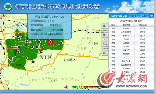 濟南市開發(fā)區(qū)等4個監(jiān)測點的空氣質(zhì)量指數(shù)(AQI)均達到監(jiān)測的極值500。
