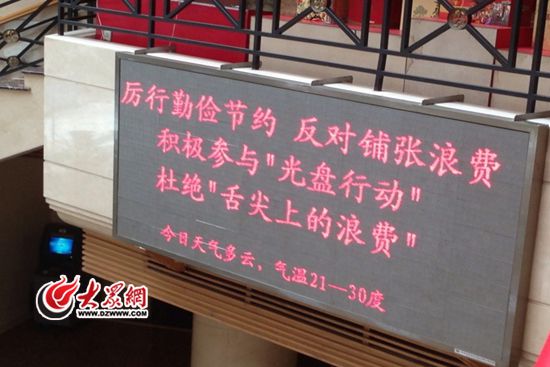 距中秋只有三天,山東新聞大廈餐飲訂單只有一份。圖為山東新聞大廈打出了“厲行勤儉節(jié)約,反對鋪張浪費(fèi)”的電子標(biāo)語