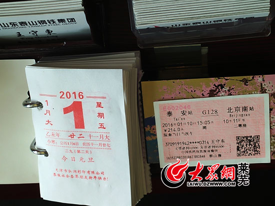 王守東辦公桌上準(zhǔn)備去北京參加會議的車票,而王守東的生命定格在了2016年1月1日(記者亓秀寶攝)
