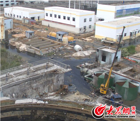 隨后,記者從高新區(qū)宣傳部門獲悉,污水廠原料儲存?zhèn)}庫發(fā)生火情導致爆炸,輕傷三人。由于廠區(qū)禁止進入,記者從航拍的畫面里面看到,爆炸點附近有輛吊車,吊車附近的幾座混凝土建筑也被炸出多個缺口,廠區(qū)內藍色污水流出。
