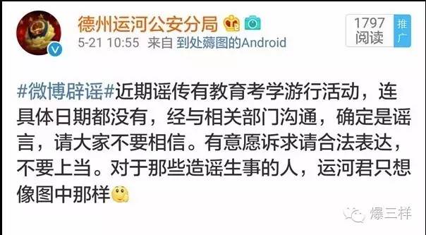 這幾天出現(xiàn)的“高考游行”謠言中,涉及山東的,樣哥已至少看到了濱州、菏澤、德州、濟寧4個版本,省外版本更是不勝枚舉。