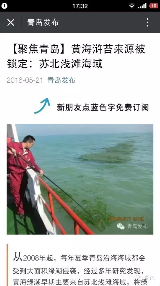 青島發(fā)布推送的滸苔來(lái)源于蘇北海域的消息