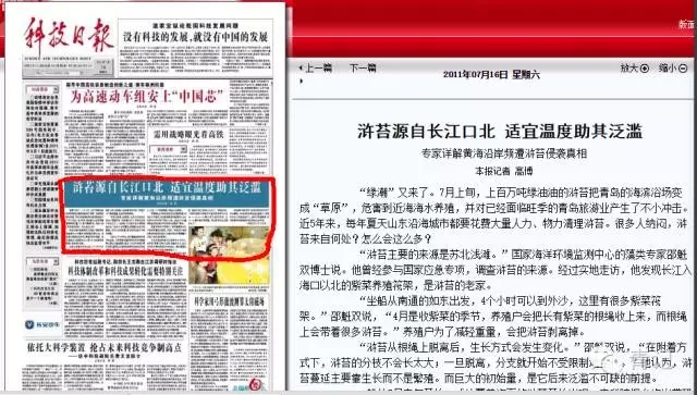 科技日?qǐng)?bào)2011年7月16日的報(bào)道:“滸苔源自長(zhǎng)江口北,適宜溫度助其泛濫”