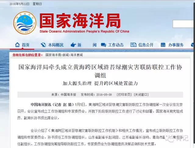 國(guó)家海洋局牽頭成立黃海跨區(qū)域滸苔綠潮災(zāi)害聯(lián)防聯(lián)控工作協(xié)調(diào)組