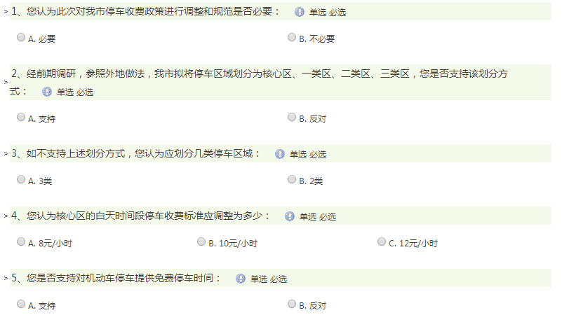 記者發現,在《公開征求意見的有關問題》的調查問卷中,關于市民認為核心區的白天時間段停車收費標準應調整為多少的問題,官方列出了8元/小時、10元/小時和12元/小時三項。關于免費停車的時間該設多長為宜的問題,官方列出了10分種 、15分鐘和20分鐘三個選項。