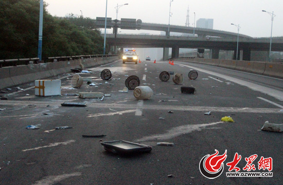 事故現場,魚筐、氣泵等雜物散落在三四十米長的路面上。