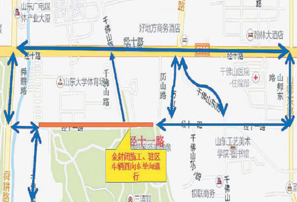 第二階段施工期間,過境車輛可繞行經十路、舜耕路、歷山路、千佛山西路、千佛山路、山師東路、千佛山東路、千佛山南路等。第三階段舜耕路至千佛山西路段,將擇機實施。