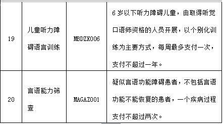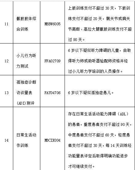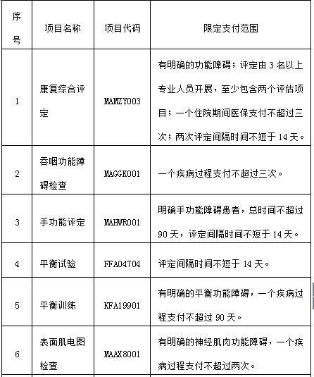 本次納入的20項醫(yī)療康復項目包括:康復綜合評定、吞咽功能障礙檢查、手功能評定、平衡試驗、平衡訓練、表面肌電圖檢查、輪椅技能訓練、耐力訓練、大關(guān)節(jié)松動訓練、徒手手功能訓練、截肢肢體綜合訓練、小兒行為聽力測試、孤獨癥診斷訪談量表(ADI)測評、日常生活動作訓練、職業(yè)功能訓練、精神障礙作業(yè)療法訓練、減重支持系統(tǒng)訓練、電動起立床訓練、兒童聽力障礙語言訓練、言語能力篩查等。