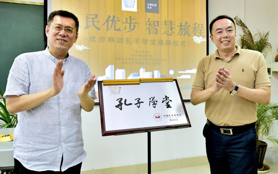 中國孔子基金會理事長王大千與優步濟南總經理石小木為首家“移動式”孔子學堂揭牌