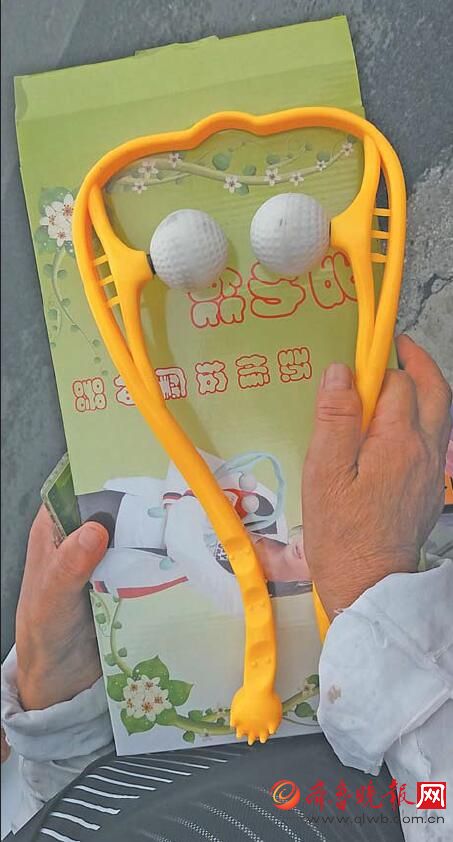 老人向齊魯晚報記者展示保健品公司贈送的“按摩神器”,市面只賣十幾塊錢。齊魯晚報記者于悅攝