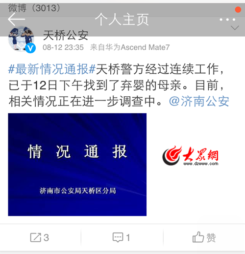 在經過了一天的漫長等待后,今晚23時30分左右,濟南市天橋區公安局再次在其官方微博上發布消息稱,“天橋警方經過連續工作,警方已于12日下午找到了棄嬰的母親。目前,相關情況正在進一步調查中。”(大眾網-山東24小時記者 孫杰 樊思思)