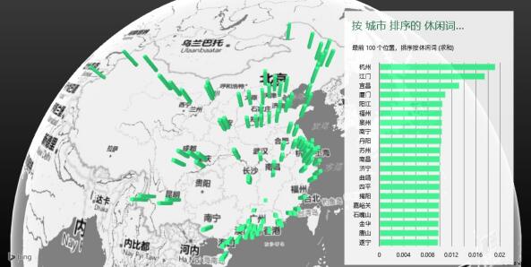 茂名市和寧波市都同時排在工作詞的前十名和休閑詞的后十名,江門市同時排在工作詞前十名和休閑詞的前十名。從總體來看,所提及的工作詞排序前十名的城市分別是江門、成都、石嘴山、保山、茂名、北京、合肥、寧波、安陽和梅州;后十名分別是四平、揭陽、常州、長春、汕頭、潮州市、南通、海口、保定和揚州。所提及 的休閑詞排序前十名的城市分別是杭州、江門、宜昌、廈門、陽江、福州、泉州、南寧、蘇州和南昌;后十名分別是汕頭、南京、齊齊哈爾、茂名、揚州、寧波、大連、海口、清遠和韶關。通過觀察這兩個方面的數據結果,我們可以發現哪些城市的網民更為關注工作內容,哪些城市的網民較多關注休閑娛樂內容,例如廣東江門這個城市提及的工作詞和休閑詞分別排在所有城市榜單的第一位和第二位,可見江門對工作內容和休閑娛樂內容的關注度都是比較高的。杭州網民“最休閑”,這與其山青水綠、詩意浪漫的環境有關。正所謂休閑在杭州,杭州還獲得過“東方休閑之都”的稱號。